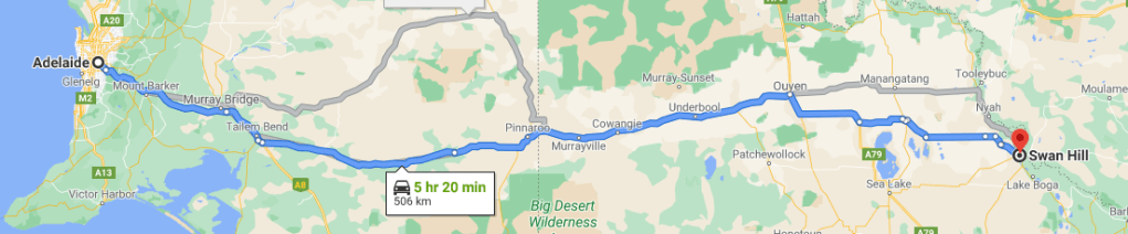 Day 1 – Adelaide to Swan Hill completed (506 km’s). Included travelling via the National Highway, Mallee Highway and across to Swan Hill via Chinkapook in the latter stages. It was a lot of driving in a very noisy van, but the kids did really well. The majority of the land travelled was noticeably farmland, especially in the Mallee area, so it was fairly characterless with minimal amounts of nature. Chinkapook was interesting, as it felt fairly remote, and roads constantly split into one lane then two, which you definitely don’t see much of in Adelaide.